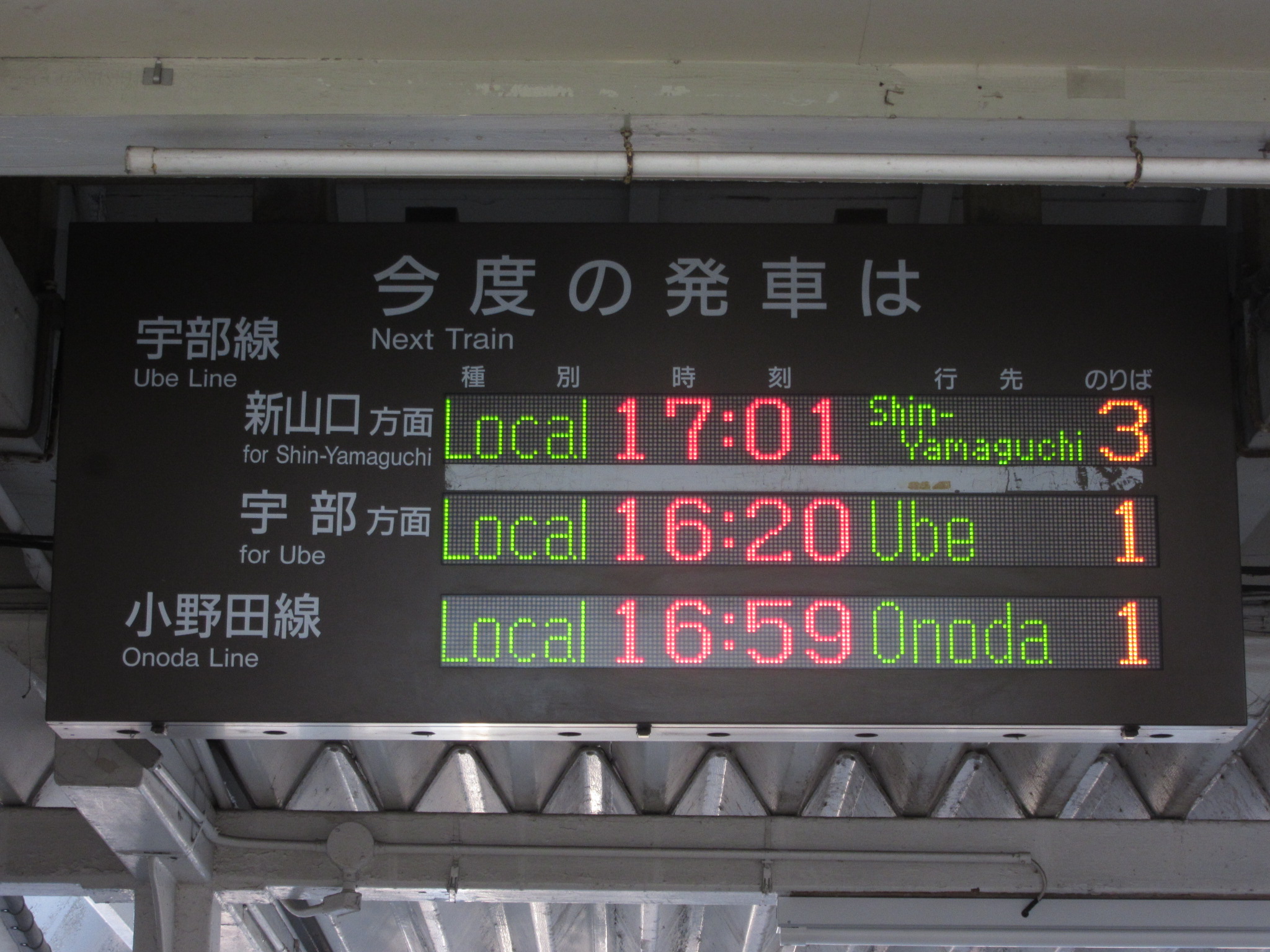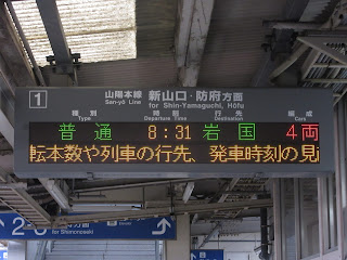岩徳線の筐体は、行先(日本語)、行先(英語)、両数(日本語)、両数(英語)の順で表示されます。