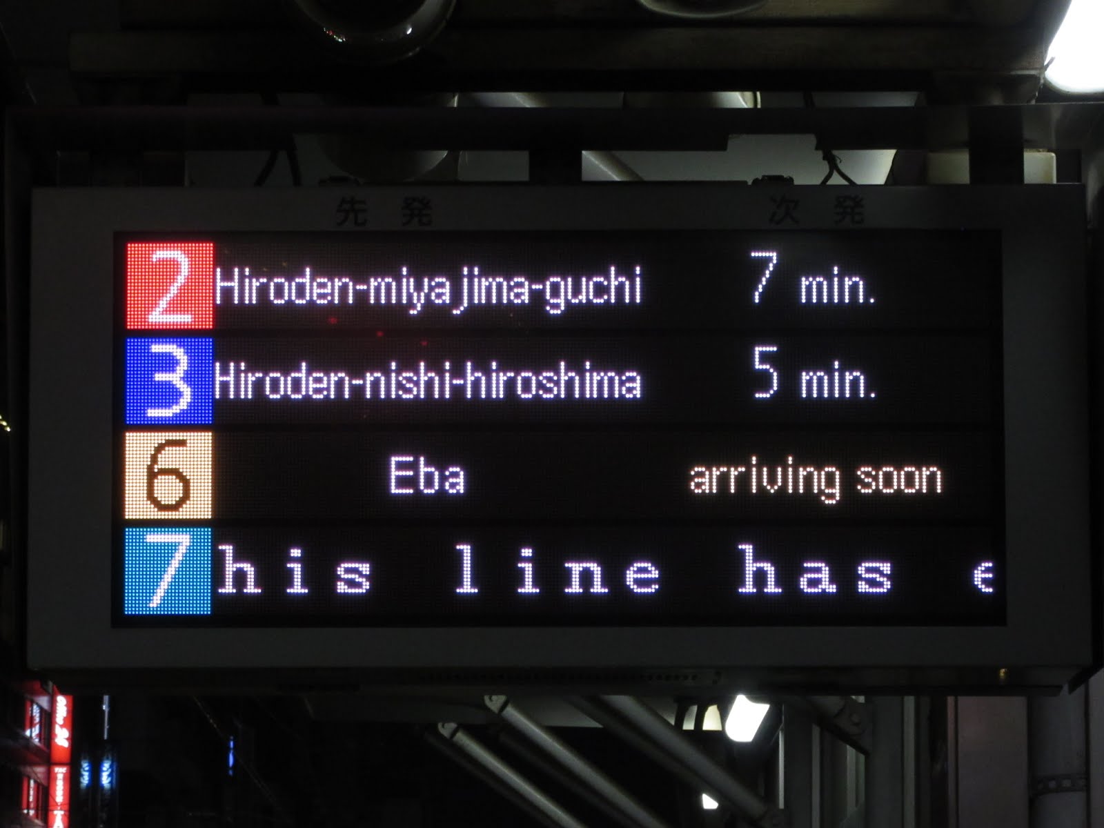 設置駅:八丁堀白島方面ホーム、広電本社前、県病院前、宇品二丁目縦幅は24ドットですが、細いフォントで表示される筐体です。横幅も狭くなっています。